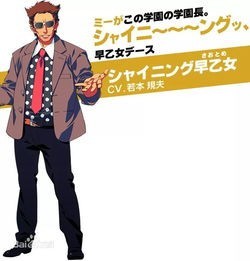 闪耀早乙女/シャイニング早乙女(しゃいにんぐさおとめ)cv:若本规夫※AmazingAria中化身早乙女光男可攻略。身份:早乙女学园学园长年龄:不详生日:11月22日星座:天蝎座身高:200cm体重:100kg血型:A型血擅长乐器:邦哥鼓(bongos)爱好:学园改造喜欢的食物:肉讨厌的食物:没有出生地:不详介绍:为了以发掘和培养新时代演艺人才,出资创办了私立艺术学校——早乙女学园。言行诡异的家伙,很神秘的学园长。每次出场都很惊人。说话时经常掺进英语。由于暗恋音也母亲,在音也母亲去世后对音也异常好。