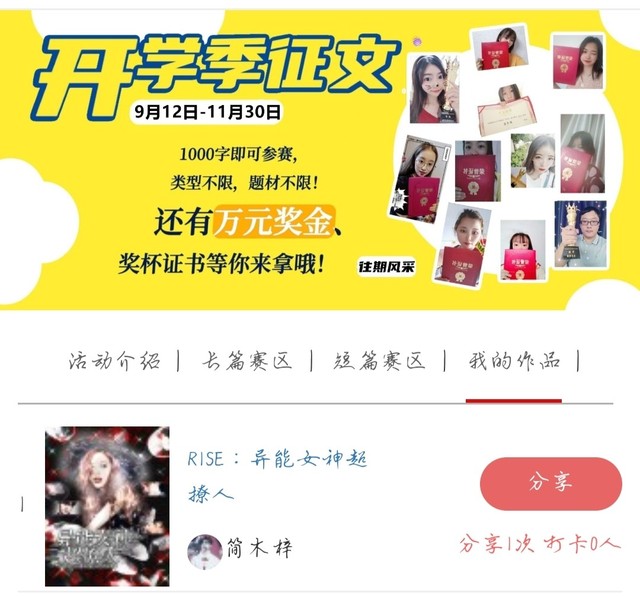 简木梓还有和大家说一件事,这本书呢,参加了开学季征文,所以呢,打卡打起来好趴