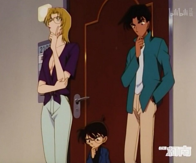 柯南手摸着下巴站在门外沉思,