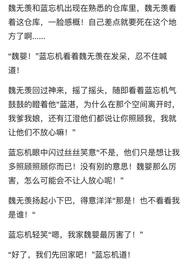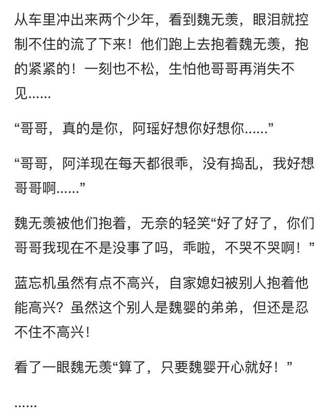 魏无羡茫然的眨眨眼,然后反应过来“对哦,赶紧回去,阿瑶阿洋还有江澄他们应该等急了,我们快走吧!”
