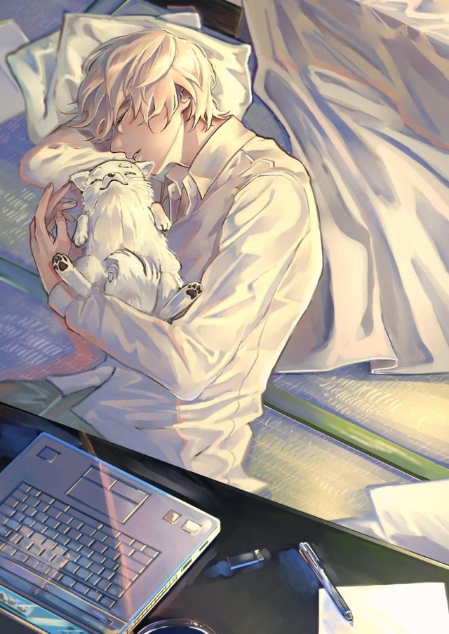 安室透侧睡着,旁边一只小狗四脚朝天的也在睡,安室透上面,有这一张小桌子还有一台笔记本电脑。