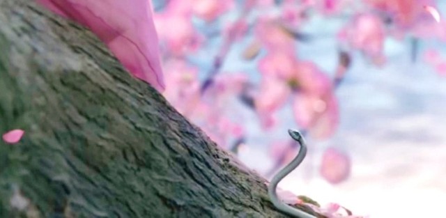 粉衣少女平躺在桃花树上,睡得很是香甜,若不仔细观看很容易忽略她的存在,此时一条想要偷吃鸟蛋的银花蛇缓缓向褚曦瑶的方向爬去。