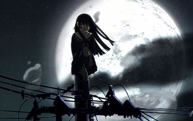 阎魔爱月色中,一身古式黑色水手服,黑色的短裙,站在电线杆上