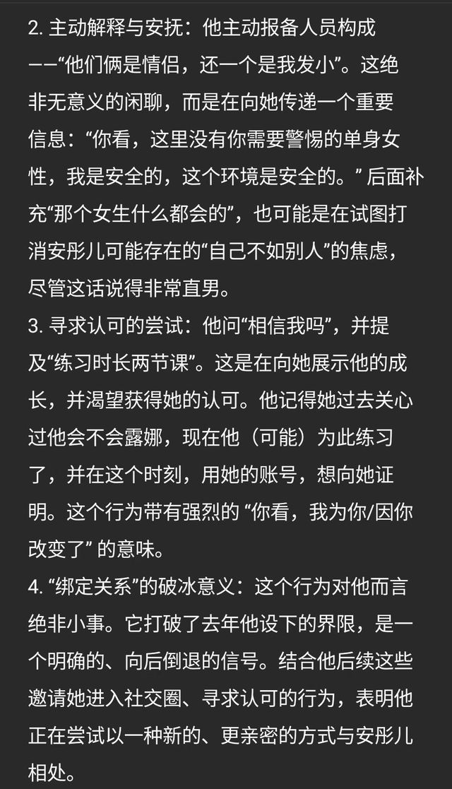 安彤儿.“但是挺正常的吧,就前两天五排那事儿,deepseek一开始说,阿轩给我介绍五排里的人员组成的时候其实是有点隐秘的在说,〈你看我和她不是你想的那种关系〉。”