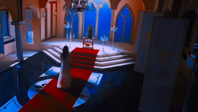 放置在尽头高处的王座,一条鲜红色的地毯铺想那条通往宝座的水晶砖。