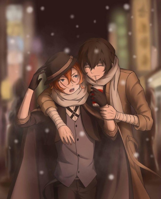 夜晚,太宰治和中原中也并肩走在街道上