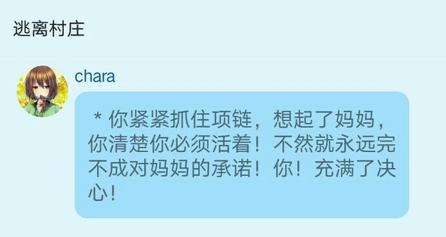 旁白君:放虎归山,承诺,这我可以直接说给你们听,放虎归山就是chara的妈妈通过一次机会逃脱,想要回来把chara也救走,可天不随人愿,当天,在她们快要离开的时候,有人发现了她们,没办法,chars的妈妈只好放了一把火,对村子造成了巨大的损失,独自逃走了……这可不是chara的妈妈不想救chars,只是迫于无奈只能独自一人先逃,不然两人都要被抓,临走前chara的妈妈留下了这个心形的项链,并承诺,一定会回来找chara的,并让chara努力的活下去!无论…什么手段!其实吧,根据旁白君的对后面的剧情的了解来看……这位妈妈还真不是什么好妈妈!因为她根本就不打算回来了!!!!留下那个项链只是想敷衍!!不过…在那个地方…这么做也合理……(对了!chara的妈妈逃走的时间是在chara四岁的时候!)
