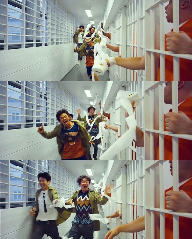 四人霸气越狱,一路上其他的狱友挥舞着卷纸,为他们欢呼!