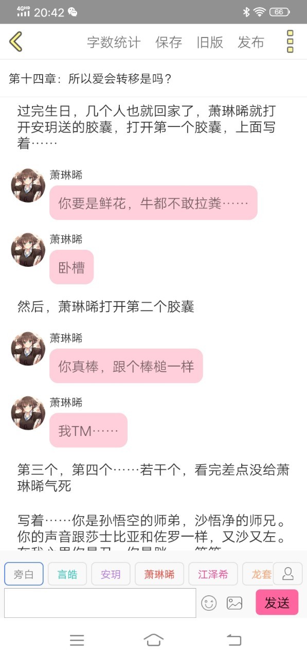 说完萧琳晞回到他(她)们那一桌,把自己的东西拿着,转身就走,剩下安玥在前台抱头痛哭,紧接着言皓他(她)们跑了过来。