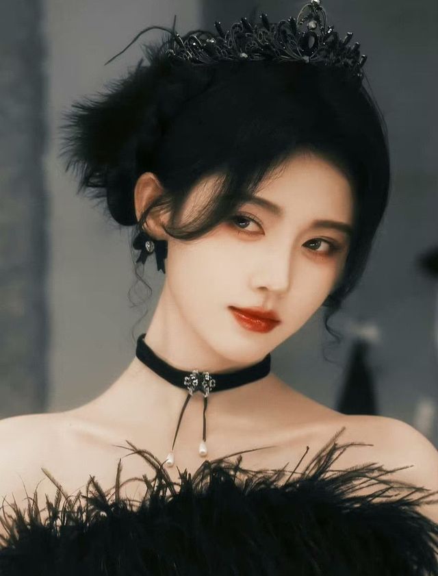 她的手上戴着黑色蕾丝手套,持一把华丽的鸦羽扇。