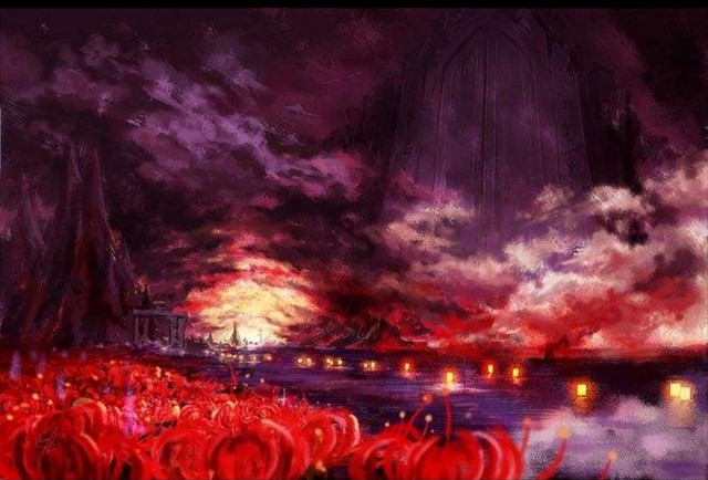 黄泉路上,盛开着大片大片的彼岸花,远远看去,就像是血铺成的地毯,花红似火,因此黄泉路也被称之为火照之路。彼岸花是自愿堕入地狱之花,花开时无叶,叶在时花凋,花叶永生永世两不相见,生生相错。相念相惜永相失。佛经记载有“彼岸花,开一千年,落一千年,花叶永不相见。情不为因果,缘注定生死”,因此只在黄泉路上开花。