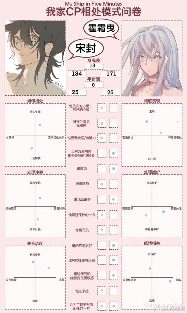 作者蓝色代表雪曳,绿色是宋封,点画的有点小表介意。表上的信息是结局时的