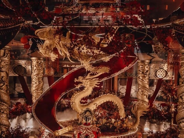 婚礼是中式的,酒店内处处挂着红色,两人身着明制汉服,同父母一起站在门口迎宾