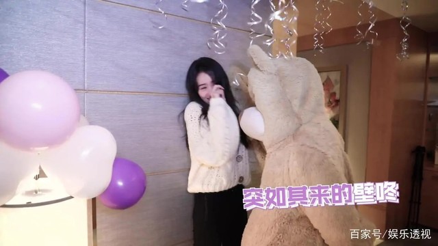 推开门,里面是浪漫的紫色气球,玩偶,鲜花布置的,袁冰妍还没来得及感动,然后成毅熊调皮的牵起袁冰妍的手,开始随意的跳起舞来。