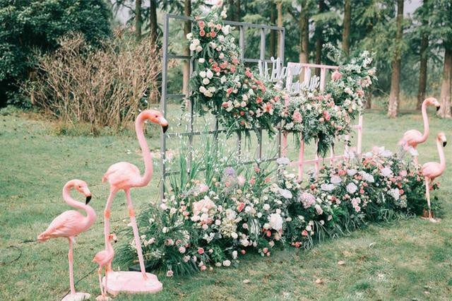 草坪上的舞台背景突然增加了一道巨大的屏障,上面挂着的是大横幅的婚纱照。