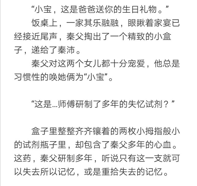 第2⃣章,秦父送给妹妹秦沛的生日礼物,是两片失忆试剂,一片可以丢失所有记忆,一片可以唤回所有记忆。