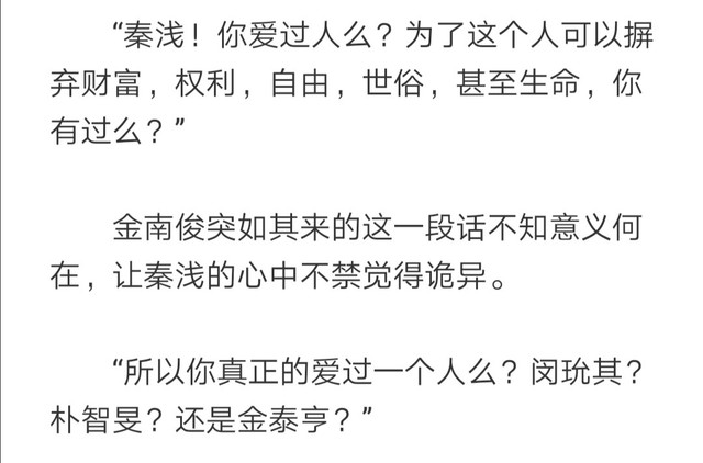 第9⃣6⃣章,秦浅对于金南俊的审问最后,金南俊问她有没有深爱着的人,其中他所提到的那些摒弃了的东西,“财富”,“权利”,“自由”,“生命”都可以解释,可“世俗”二字也是暗示了金南俊对于郑号锡的感情是脱逃世俗的。