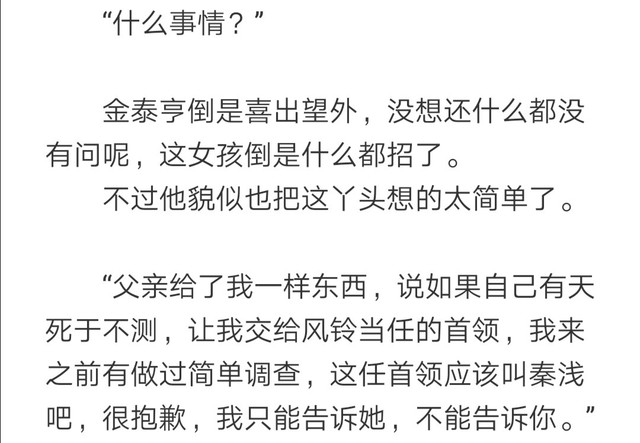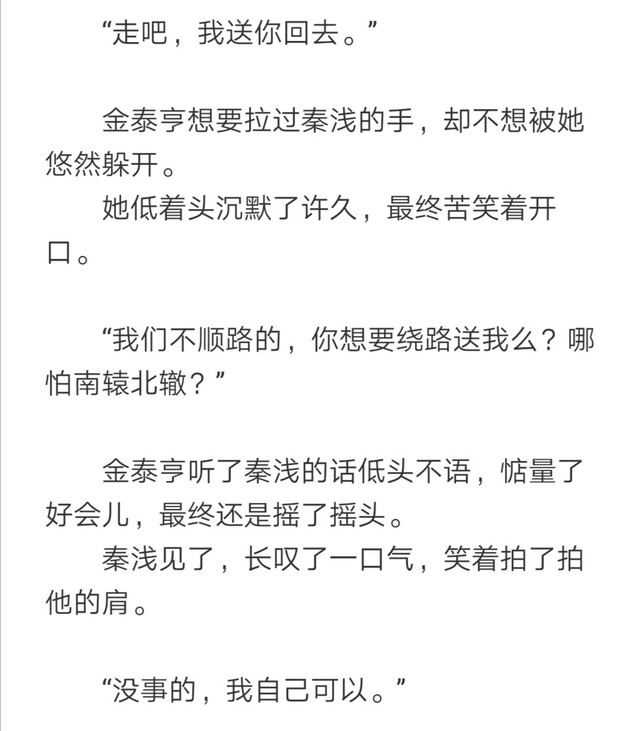 第1⃣1⃣7⃣章,金泰亨说自己与秦浅不是一路人,后来分别时他提出要送秦浅,秦浅说两人不顺路,可否愿意南辕北辙。