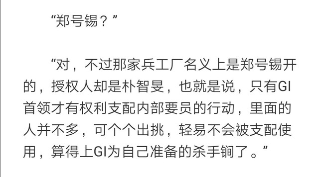 第1⃣0⃣6⃣章,这里提到了只有GI首领才可以支配兵工厂要员的行动,可兵工厂却是郑号锡的,朴智旻无非挂名而已,与后文郑号锡才是真正GI首领,是他筹划了一切陷害风铃一家相对应。