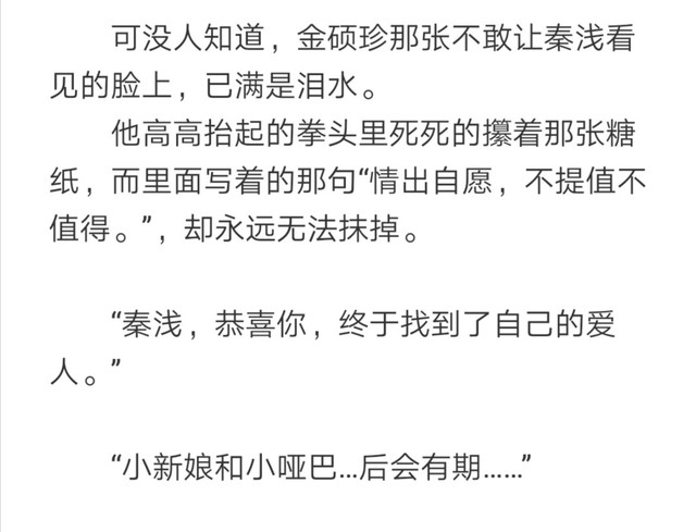 第1⃣1⃣8⃣章,金硕珍手中的糖纸,上面的“情出自愿不提值不值得”永远没办法抹掉,也象征着金硕珍对于秦浅的爱根本没办法释怀。