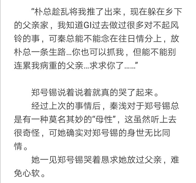 第1⃣1⃣9⃣章,这里就是郑号锡在秦浅跟前“卖可怜”罢了,他想把自己摘出来,他知道GI和朴智旻都不中用了,他提前与秦浅说这些,是想要将自己保下来,方便日后复仇。
