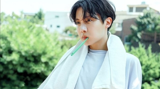 金南俊正伏在洗漱台前昏昏欲睡的洗漱,而郑号锡却倚在外头的阳台上,脖子上挂着一条围巾,迎着晨光,刷着牙。