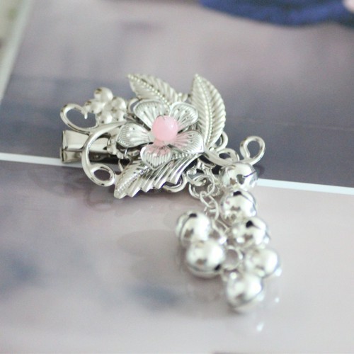 银白色的花朵,下面是各种小铃铛,粉色的花心,簪子很漂亮。