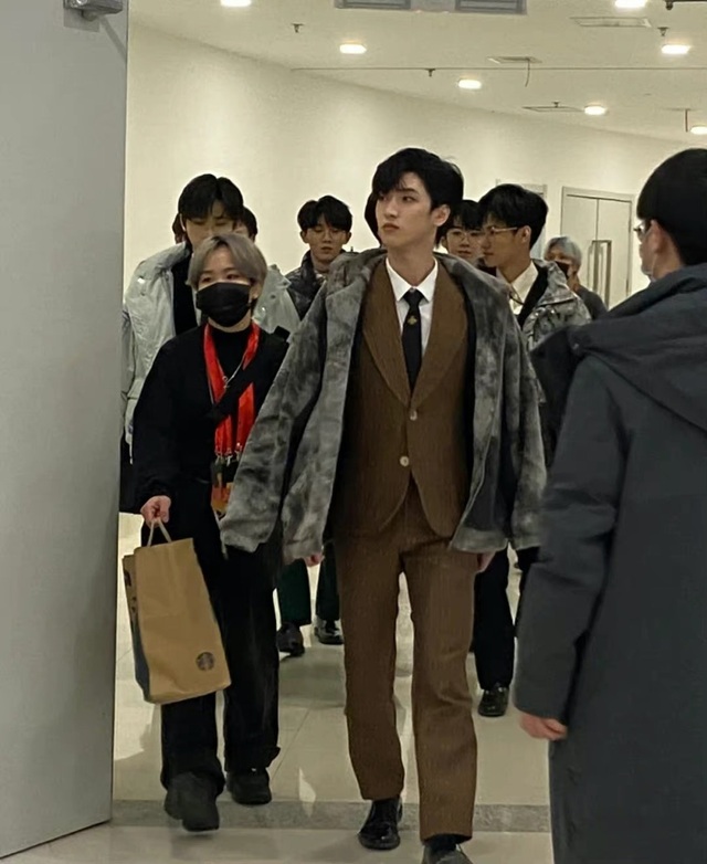 严浩翔深棕色西装外套上还披着一件外套,大步的朝着宁稚走来