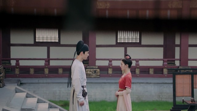 两人正在一旁的院落里说着什么。
