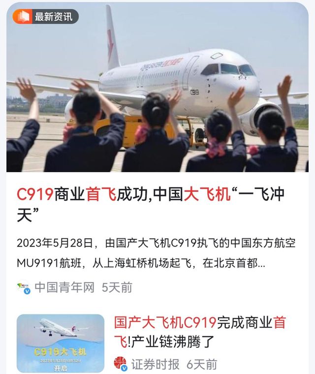 就在5月28日,我国自主研发的大型喷气式客机C919,成功的在北京与上海之间实现商业首飞,让人由衷的祝贺。这是科技的进步,也体现了中国制造的速度!