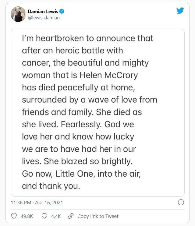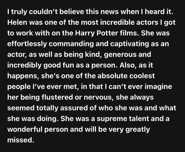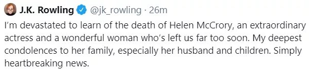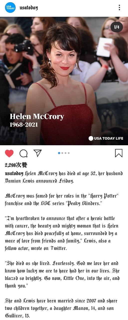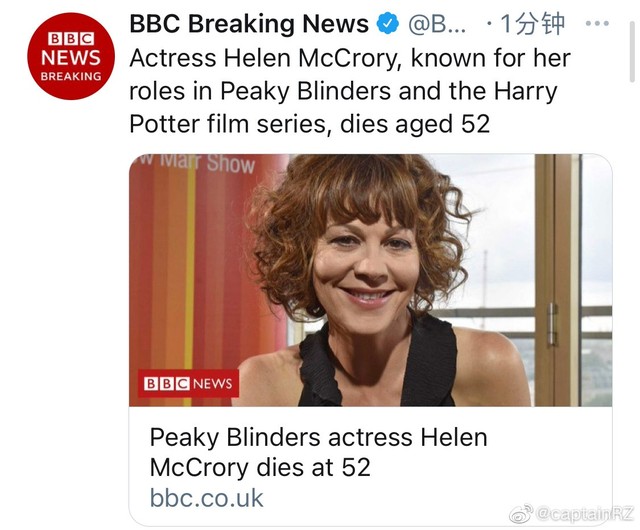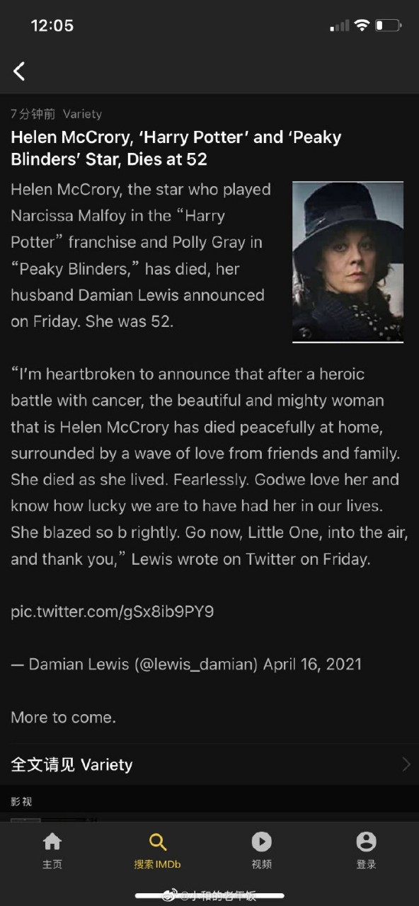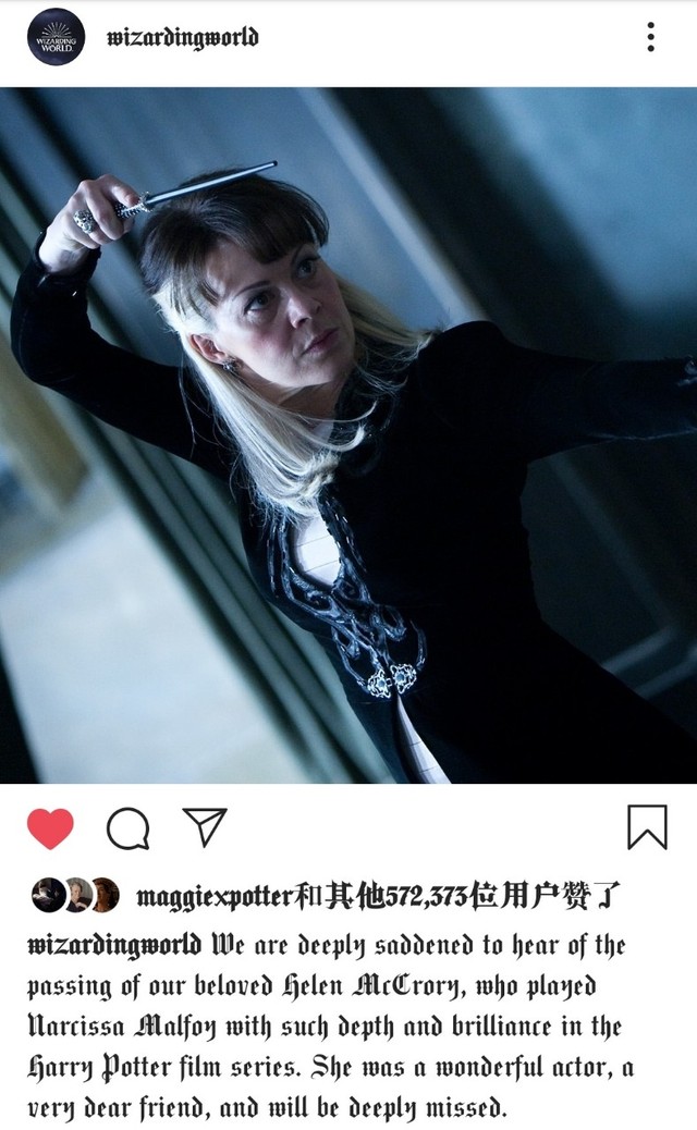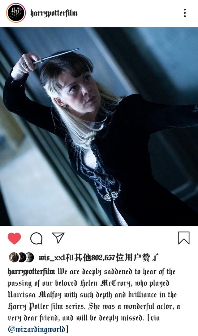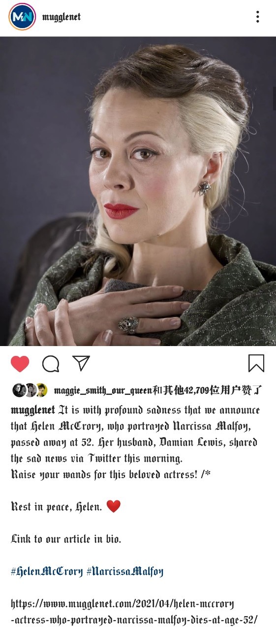 霙玥昨天(4月16日)晚上11点58分的时候,在微博上看见了Narcissa的饰演者Helen McCrory因为癌症去世的消息。现在我根本不敢打开微博、Instagram等,因为目力所及全是她去世的消息(有时也会提到《哈利·波特》中其他去世的演员)。她的百度百科词条变成了灰色。我不知道会不会在我的同人文里写到Narcissa,但是我真的觉得Helen McCrory是一个优秀的、伟大的演员。她的去世是一个损失,整个英国演艺圈为之心碎。希望天堂没有病痛。Rest In Peace!
