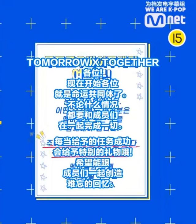 几个人在过节目组的任务卡,小奎用标准的普通话朗读了一遍,你得到了几个信息。不管什么时候都得和成员一起完成,礼物