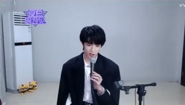 刘耀文拿着话筒,眼睛微微眯着