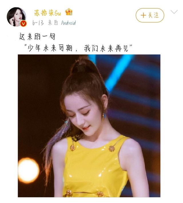 就在世人认为她不会再回到娱乐圈的时候,她在6.13日,也就是R1SE解散的前一天,发了微博