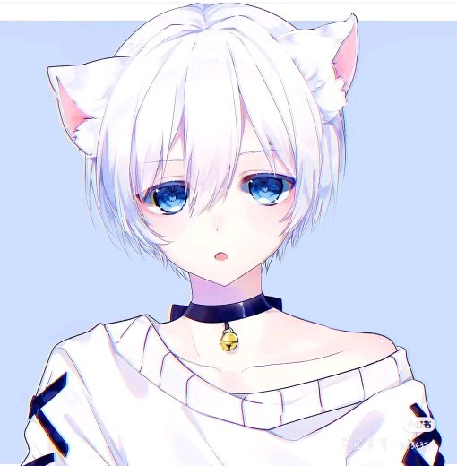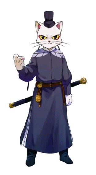 外貌(可以上图可以描述):一只蓝耳朵的白猫,背上有一把高仿正义铃