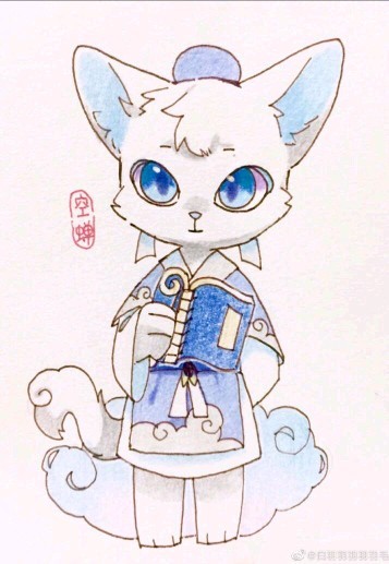 外貌(可以上图可以描述):戴着一顶黑色冒子,身穿一身蓝黑色的衣服。平滑的额头,树叶一般大小的耳朵,眼睛是棕色的,瞳孔是白色的