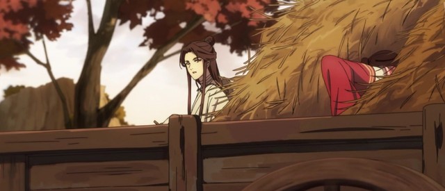 谢怜一眼望过去,就见那高高的稻草堆上,一个红衣墨发的少年正枕着手臂躺在那边小憩,看起来既惬意又悠闲。他的一双黑靴紧贴着修长笔直的小腿令谢怜想到那晚在与君山所见,发现没有银链才舒了口气。