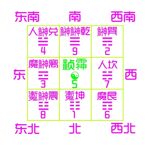 坤魙☵1巽鰰☴2离魔鰰☵3兑人鰰☱4祯䨩☯5艮魔☶6坎人☵7震魙鰰☳8乾鰰鰰☰9