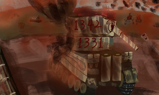 但到了驾驶室我才发现,转动机制已经被先前那发炮弹摧毁,我只能像老鼠一样缩在坦克内部,等待着空袭过去。