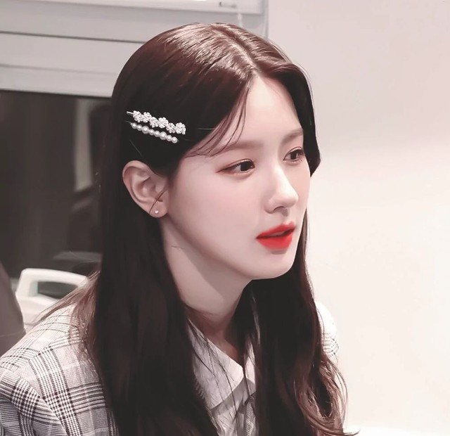 少女穿着一身格子外套,里面搭配着白色衬衫娃娃领,头发散开,一旁夹着白色珍珠发卡,煞是好看
