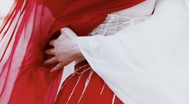 虽是一袭红色长衫,却未沾染丝毫人间烟火。吹弹可破的肌肤在月光的喷洒下,犹如披上一层神秘的面纱。