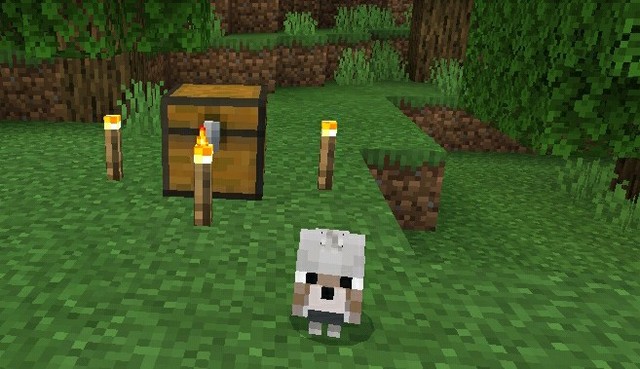 一只狗子,一个箱子,四个火把。