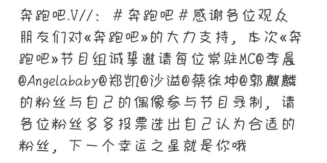 奔跑吧.V//:#奔跑吧#感谢各位观众朋友们对«奔跑吧»的大力支持,本次«奔跑吧»节目组诚挚邀请每位常驻MC@李晨@Angelababy@郑凯@沙溢@蔡徐坤@郭麒麟的粉丝与自己的偶像参与节目录制,请各位粉丝多多投票选出自己认为合适的粉丝,下一个幸运之星就是你哦