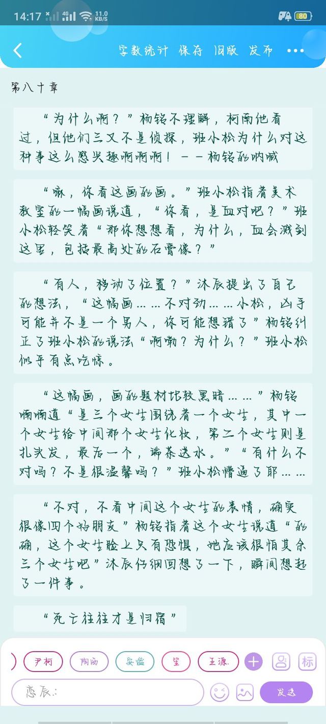 班小松刚站起身准备开门却被沐辰拉住了“等等,先别走。”幸好班小松蹲下去很及时,没有被那个人看见,那个人没有走,ta在这附近徘徊。