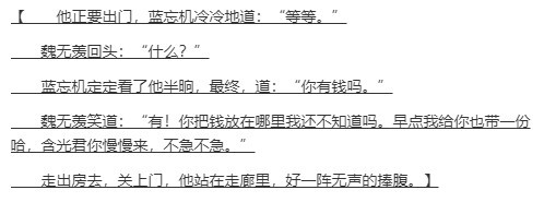 其他人只当是魏无羡的恶趣味,而蓝忘机却为了那句开心不禁在想,他对于魏无羡来说是不是也算是特别?只是来不及欣喜又唾弃起自己的这些不为人知的心思。