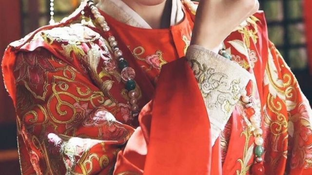 刘子固身上穿着婚服,阿绣眼含泪水手抚摸着刘子固的脸庞。