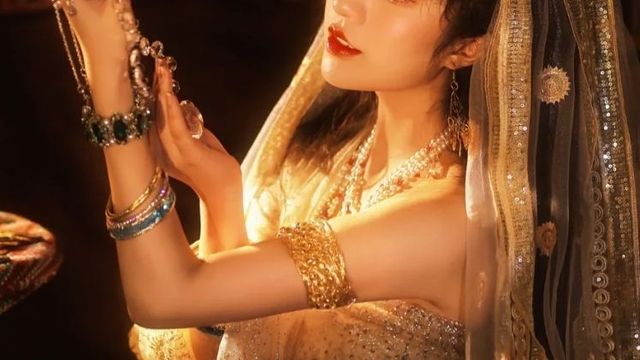 手脚带着金色的铃铛,头上是一件金色的头纱。