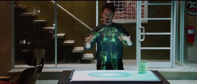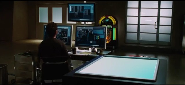 托尼.斯塔克滑动屏幕上的建模,转过身滑到桌子上,