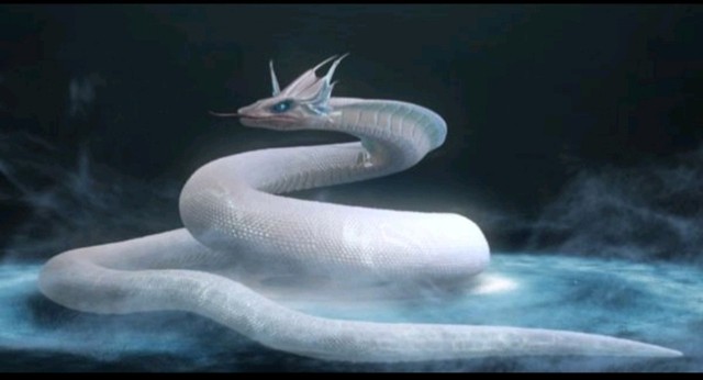 只见一条巨大青白色的巴蛇游弋过来……