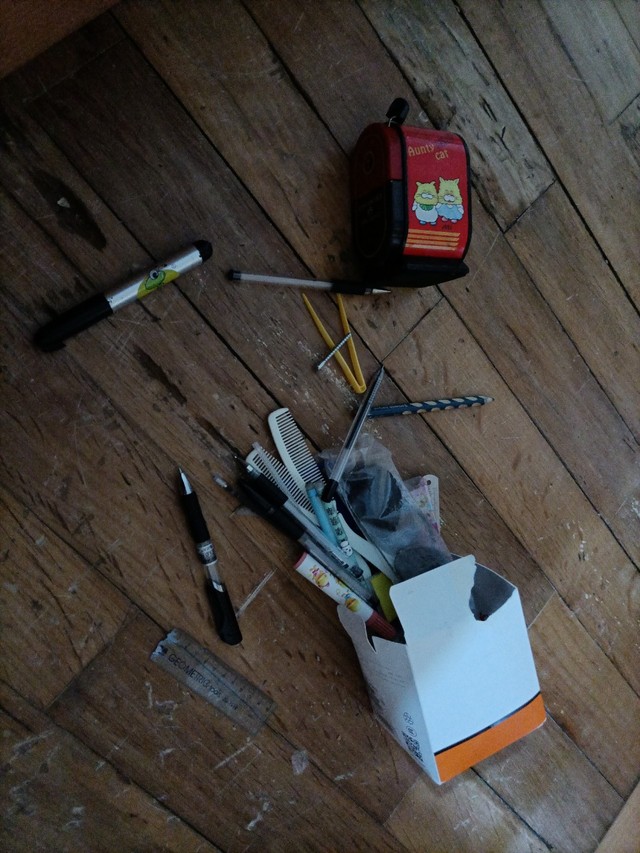 桌子倒在地上,上面的东西散了一地。文件、水杯、花盆,都掉在地上了。